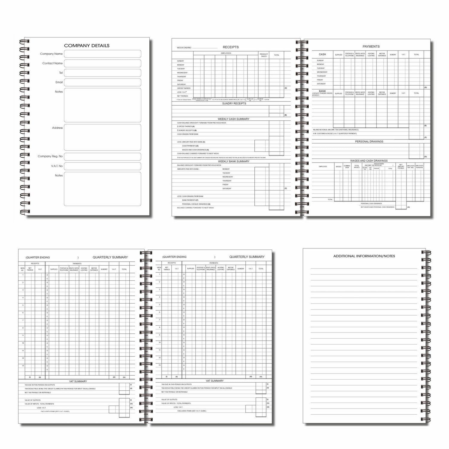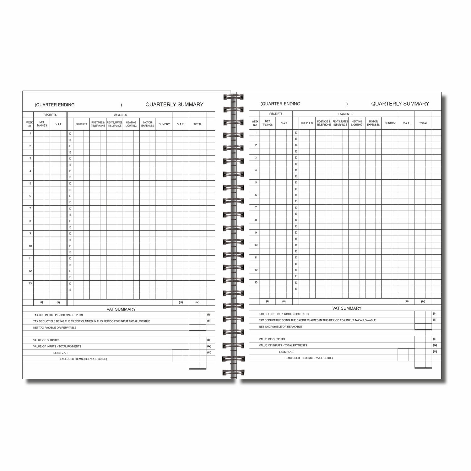 - Quarterly summaries & VAT section – contains 4 dedicated quarterly summary pages at the back with detailed VAT calculations for streamlined reporting
